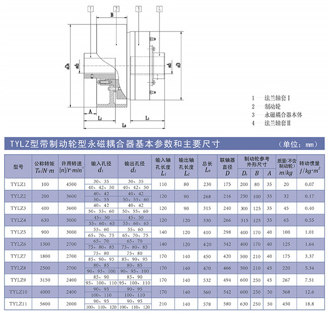 ■TYLZ型永磁耦合聯(lián)軸(保護(hù))器為帶制動輪型,也可分為單法蘭軸套與雙法蘭軸套兩種聯(lián)接方式;